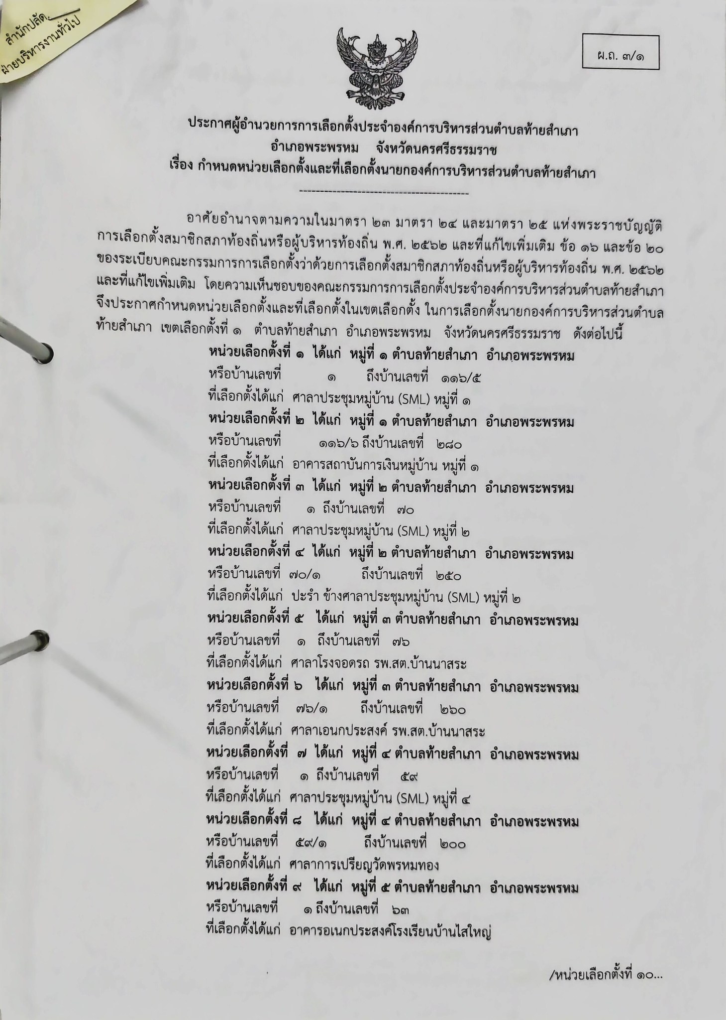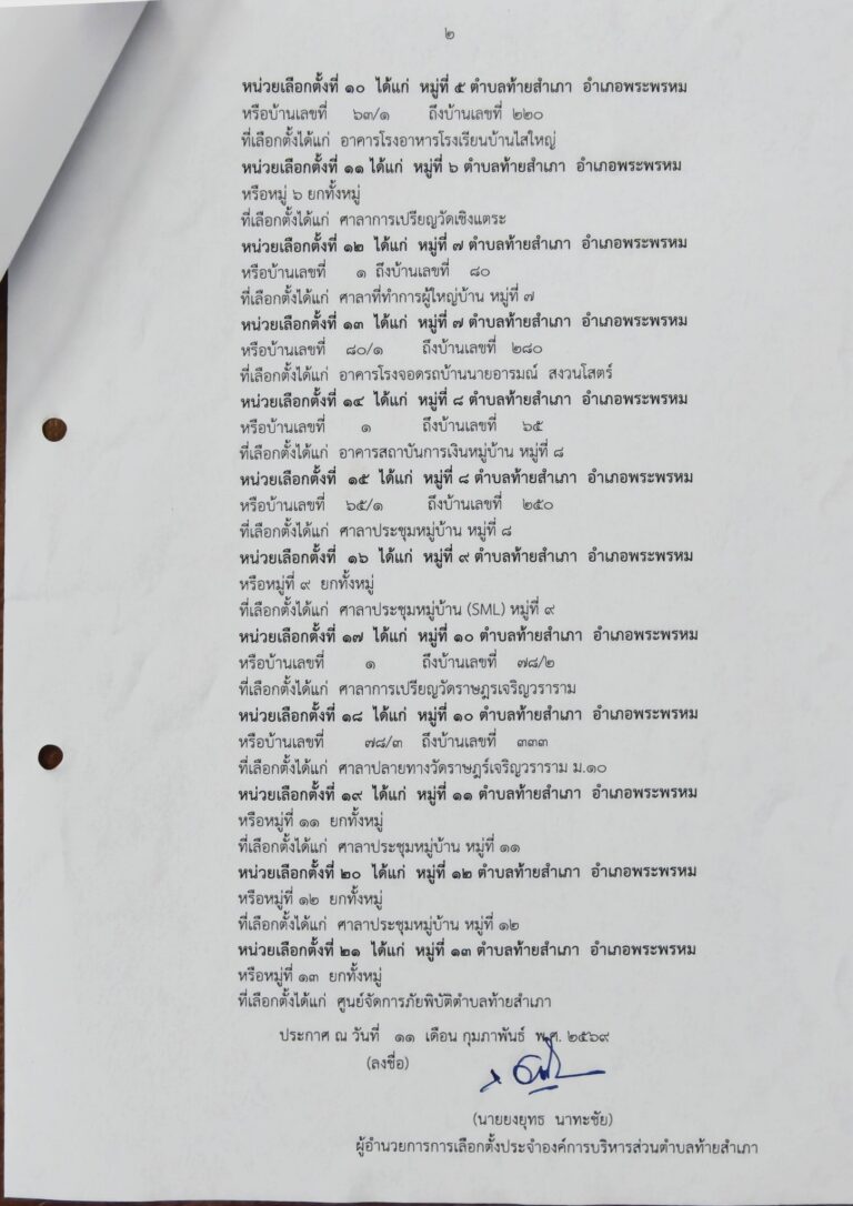 เรื่อง กำหนดหน่วยเลือกตั้งและที่เลือกตั้งนายกองค์การบริหารส่วนตำบลท้ายสำเภา