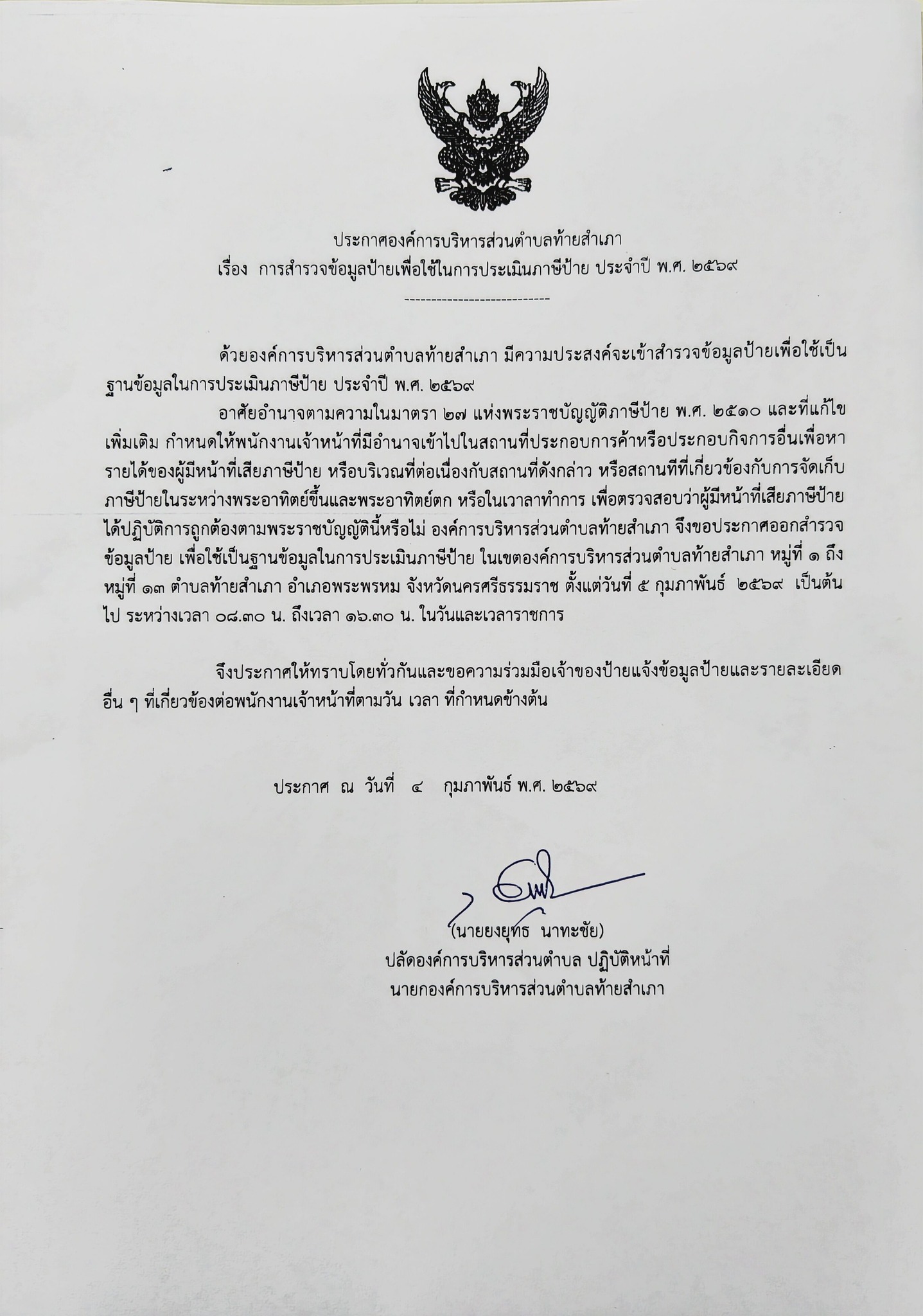 อาศัยอำนาจตามความในมาตรา 27 แห่งพระราชบัญญัติภาษีป้าย พ.ศ.2510 และที่แก้ไขเพิ่มเติม กำหนดให้พนักงานเจ้าหน้าที่มีอำนาจเข้าไปในสถานที่ประกอบการค้าหรือประกอบกิจการอื่นเพื่อหารายได้ของผู้มีหน้าที่เสียภาษีป้ายหรือบริเวณที่ต่อเนื่องกับสถานที่ดังกล่าวหรือสถานที่ที่เกี่ยวข้องกับการจัดเก็บภาษีป้ายในระหว่างพระอาทิตย์ขึ้นและพระอาทิตย์ตก หรือในเวลาทำการ เพื่อตรวจสอบว่าผู้มีหน้าที่เสียภาษีป้ายได้ปฏิบัติการถูกต้องตามพระราชบัญญัตินี้หรือไม่ องค์การบริหารส่วนตำบลท้ายสำเภา จึงขอประกาศออกสำรวจข้อมูลป้าย เพื่อใช้เป็นฐานข้อมูลในการประเมินภาษีป้าย ในเขตองค์การบริหารส่วนตำบลท้ายสำเภา หมู่ที่ 1 ถึงหมู่ที่ 13 ตำบลท้ายสำเภา อำเภอพระพรหม จังหวัดนครศรีธรรมราช ตั้งแต่วันที่ 5 กุมภาพันธ์ 2569 เป็นต้นไป ระหว่างเวลา 08.30 ถึงเวลา 16.30 น. ในวันและเวลาราชการ