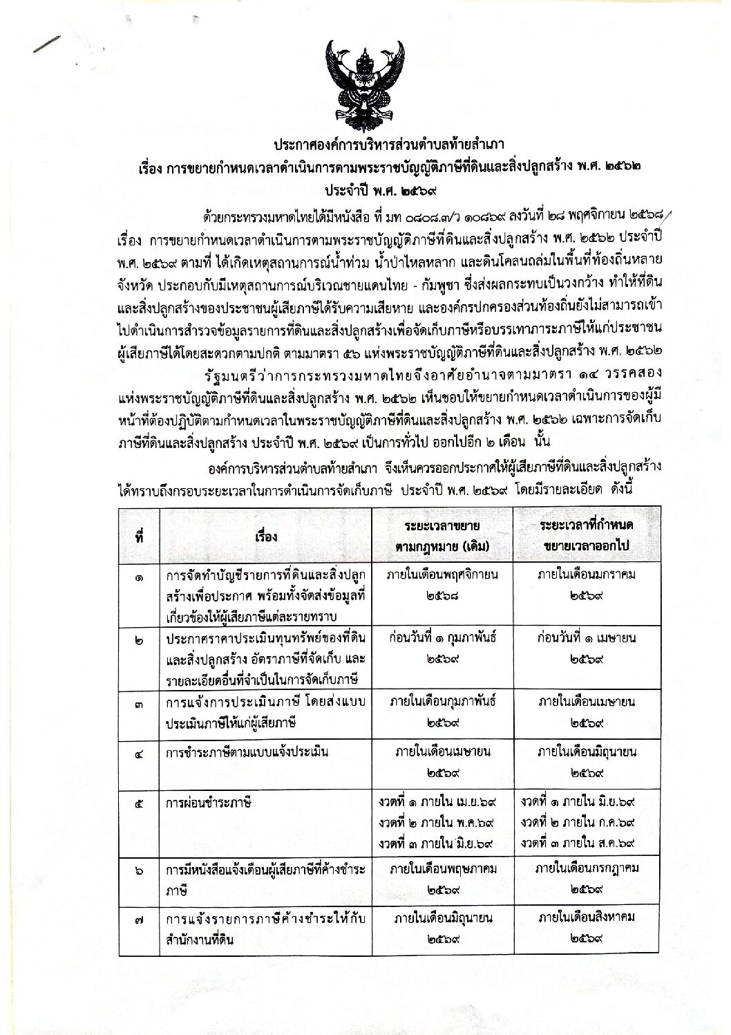 ประกาศองค์การบริหารส่วนตำบลท้ายสำเภา เรื่อง การขยายกำหนดเวลาดำเนินการตามพระราชบัญญัติภาษีที่ดินและสิ่งปลูกสร้าง พ.ศ.๒๕๖๒ ประจำปี พ.ศ.๒๕๖๙