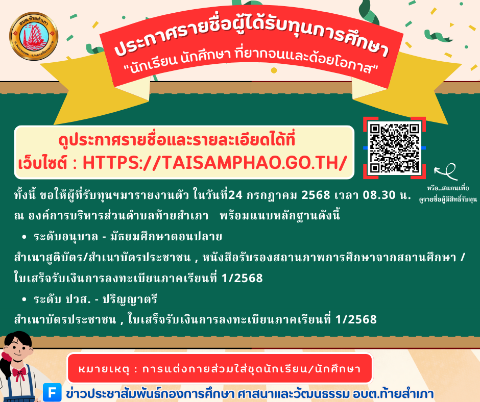 19 มิถุนายน 2568 Post Views: 499 ดาวน์โหลดไฟล์ ประกาศ รายชื่อผู้มีสิทธิ์ได้รับทุนการศึกษา นักเรียน นักศึกษา ที่ยากจนและด้อยโอกาสสีเขียว สีน้ำตาล น่ารัก เรียบง่าย กระดานดำ