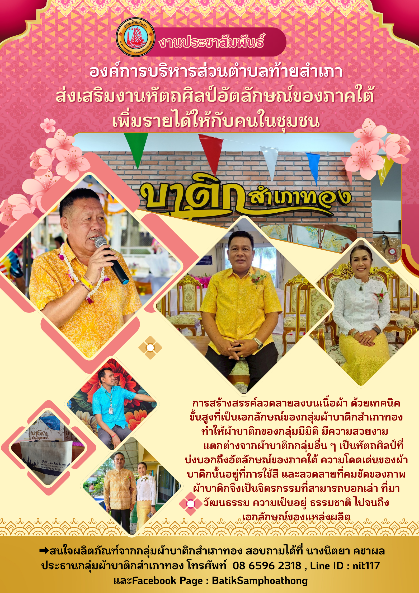 สนใจผลิตภัณฑ์จากกลุ่มผ้าบาติกสำเภาทอง สอบถามได้ที่ นางนิตยา คชาผล ประธานกลุ่มผ้าบาติกสำเภาทอง โทรศัพท์ 08 6596 2318 , Line ID : nit117 และFacebook Page : BatikSamphoathong