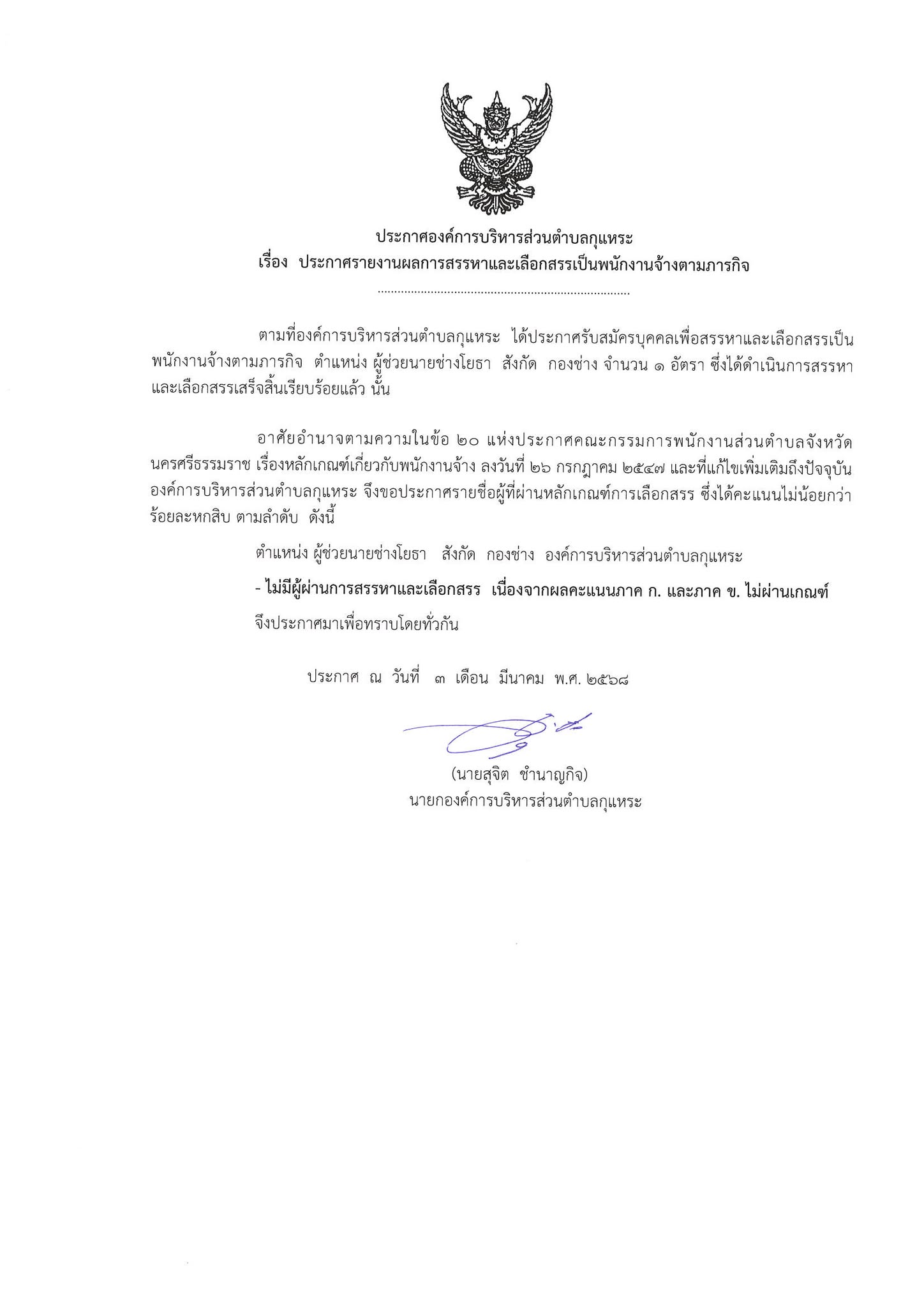 ประกาศ อบต.กุแหระ เรื่อง ประกาศรายงานผลการสรรหาและเสือกสรรเป็นพนักงานจ้างตามภารกิจ ตำแหน่ง ผู้ช่วยนายช่างโยธา สังกัด กองช่าง องค์การบริหารส่วนตำบลกุแหระ
